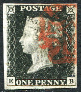 1d Black (EB) Plate 4--Fine Used cancelled by Red MX which leaves profile clear. 4 very good to large margins--£160
